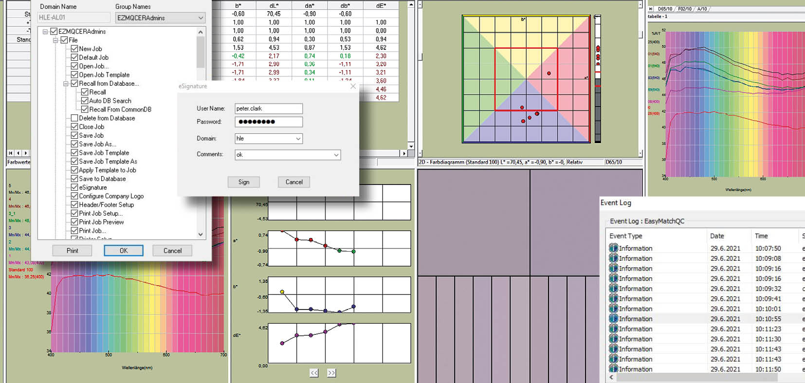El software EasyMatch QC de HunterLab incluye en la versión ER (Electronic Recordkeeping) todos los añadidos importantes para cumplir la normativa de la FDA (Food Drug Administration) según el 21 CFR Parte 11. EasyMatch QC ER incluye un Cuaderno de Validación y Cumplimiento con protocolos IQ y OQ y plantillas PQ. El software protege y gestiona registros completos y precisos, verifica y limita el acceso al sistema, proporciona una pista de auditoría generada por ordenador e incluye una firma electrónica para permitir una documentación a prueba de manipulaciones.