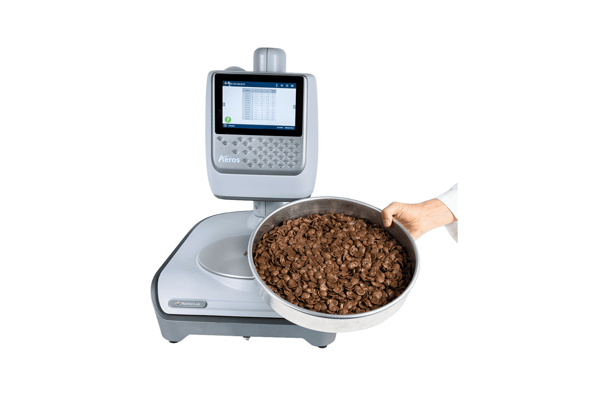 Aplikace Aeros-cerealsVzhledem k tomu, že obiloviny se skládají z jednotlivých nestejnorodých částic, je zde povrch posuzován jako celek. Při měření barvy obilovin pomocí přístroje Aeros od společnosti HunterLab se produkt z jedné dávky několikrát naplní do misky, která rotuje pod excentricky umístěným senzorem (velikost misky lze měnit v závislosti na dostupném množství vzorku). Během otáčení se provede několik měření za sebou a automaticky se vypočítá průměrná hodnota. Díky neobvykle velké snímané měřicí ploše lze velmi přesně reprodukovat barvu potravin. Vzhledem k tomu, že tato bezkontaktní metoda měření je uživatelsky velmi přívětivá a výsledky měření jsou velmi přesné a opakovatelné, společnost HunterLab tuto metodu obecně doporučuje pro měření obilovin. Manipulace s tímto typem vzorku je jednoduchá, protože zásobník se jednoduše naplní produktem a umístí na otočný stůl. Ujistěte se, že je dno mísy zcela zakryto materiálem.
